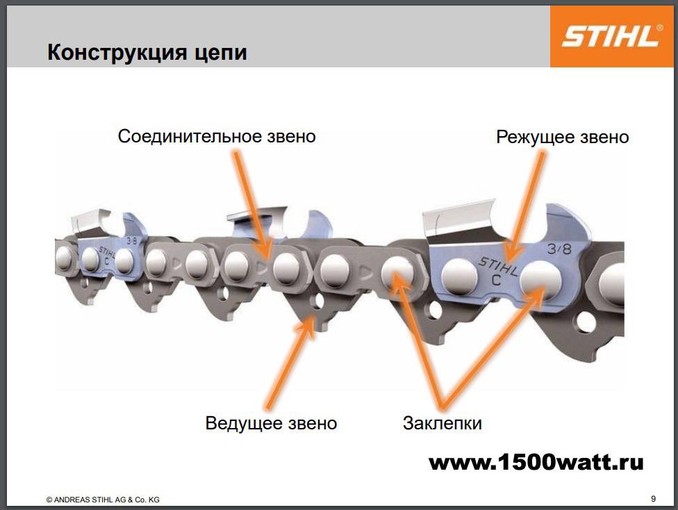 - Stihl является очень известной швейцарской маркой, которая производит пильные цепи из высокопрочной хромоникелевой стали. Они не растягиваются при нагреве, как обычные. Это достигается благодаря использованию при производстве специального метода горячей клепки. Кроме всего, данный производитель запатентовал способ смазки — “канавки”, которыми снабжаются все ведущие звенья.