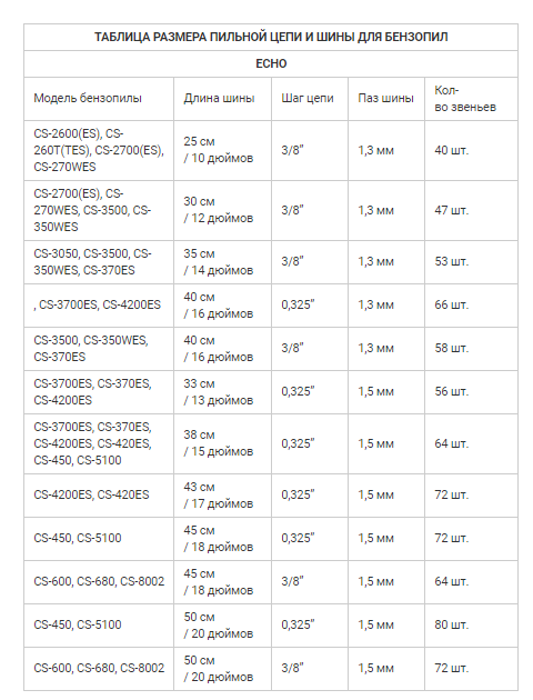 По таблице можно быстро узнать, какой тип пильной гарнитуры в зависимости от шага нужен под имеющийся инструмент.