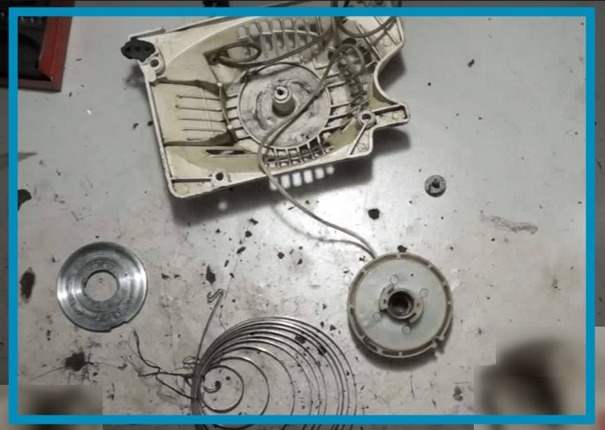Если сломалась пружинка стартера для бензопилы, что часто встречается на агрегатах китайского происхождения, то нужно произвести ее замену. Менять полностью весь стартер при этом не понадобится.