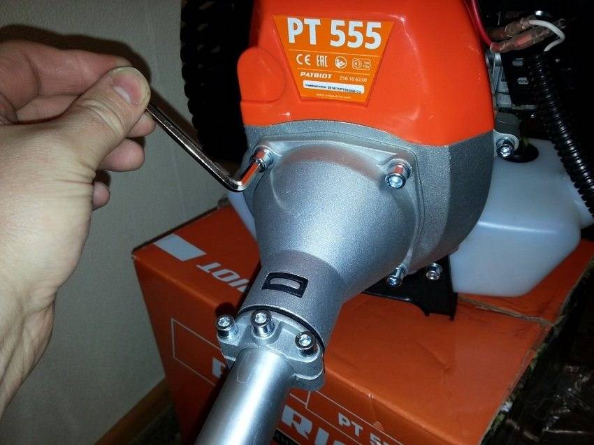 - Вкручиваем фиксирующий винт и закрепляем верхнюю часть штанги триммера боковыми винтами в крышке муфты сцепления.