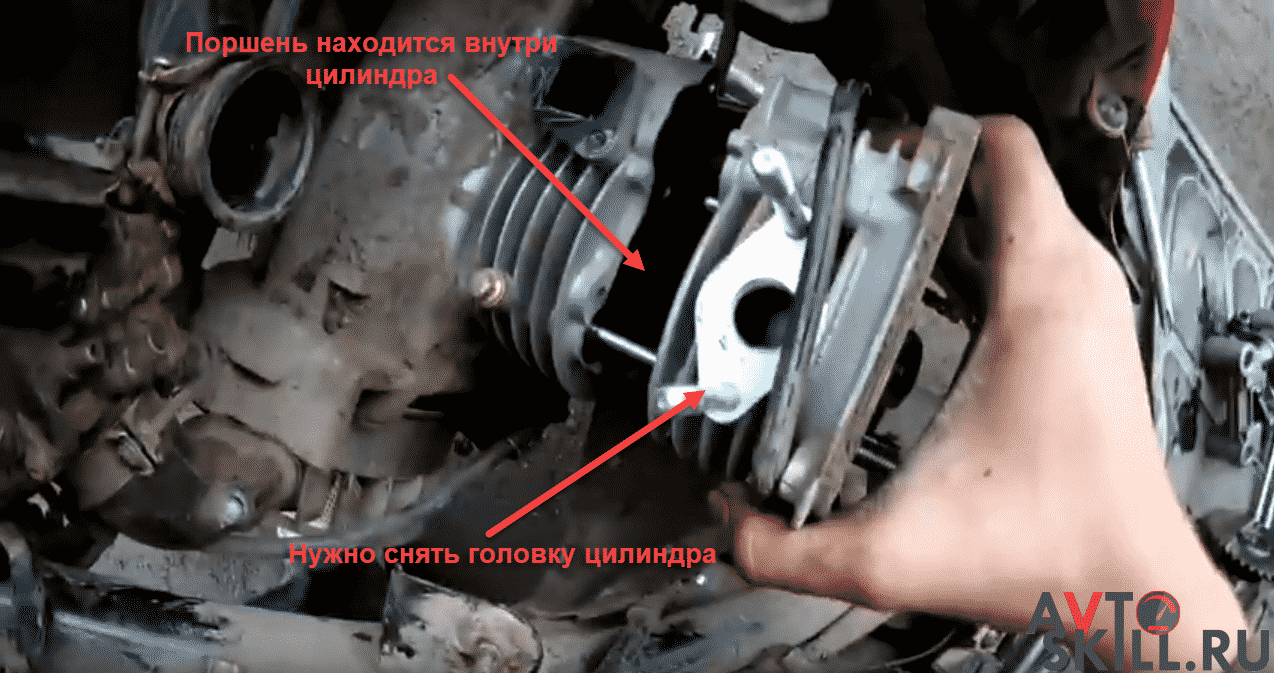 Чтобы добраться до поршня по итогу нужно снять головку цилиндра, а затем и сам цилиндр
