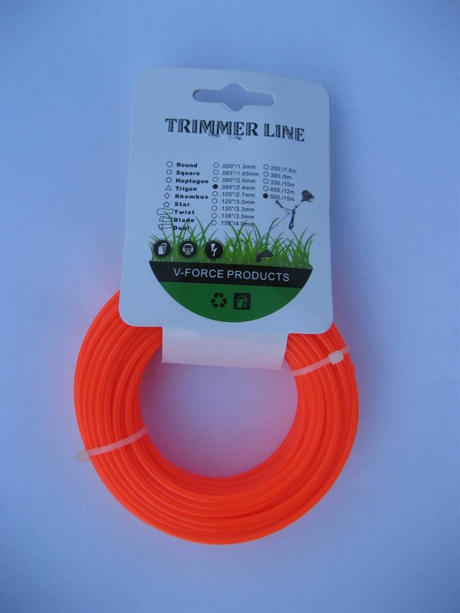 - Фигурный. Сечение затейливое, ребристое. Выглядит как звездочка или витой квадрат с выемками, в общем – сложная геометрическая фигура. Это специализированный корд. К каждому прилагается инструкция, что именно он срезает. Например, звездочка – идеально стрижет газонную траву. Она хоть и стоит немного дороже, но режет аккуратно, кончики травяного покрова выглядят привлекательно и не сохнут послу среза.