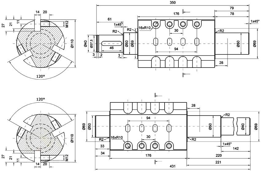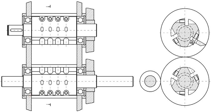 - Рабочий вал. Скорее всего, эту деталь придётся заказать у токаря, предоставив ему чертёж. При проектировании не забудьте предусмотреть способ крепления ножевого блока и деталей привода. Лучше всего, если токарь сделает на валу продольный паз под шпонку.
