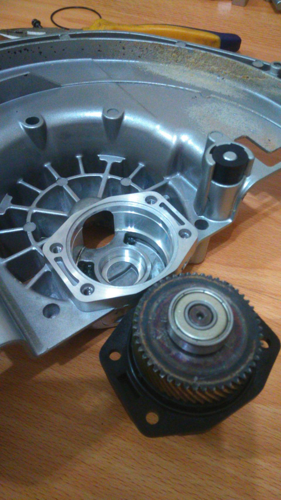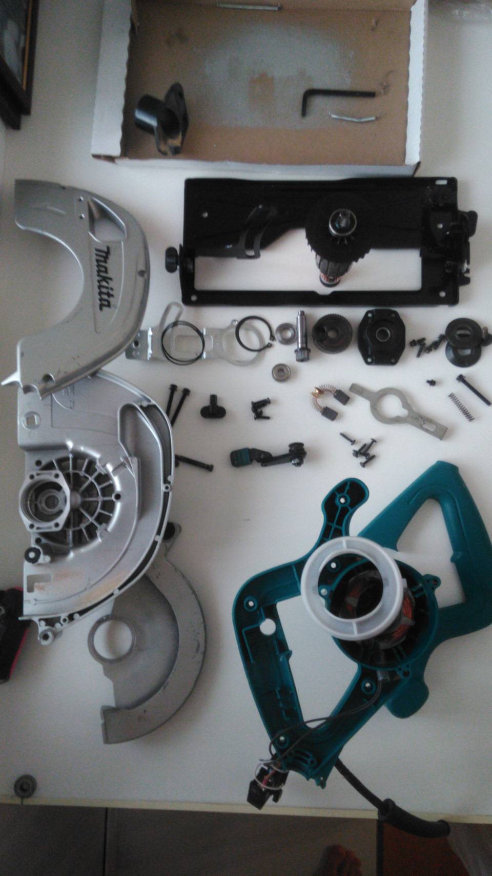Спрессовал все обратно на новых деталюхах используя молоток и головки на 10, 12, 17. С редуктором все. Алюминиевый кожух пилы и пластиковые детали корпуса отмыл с помощью средства Profoam-1000, щелочи входящие в состав этой химии отлично отмывают древесные смолы.