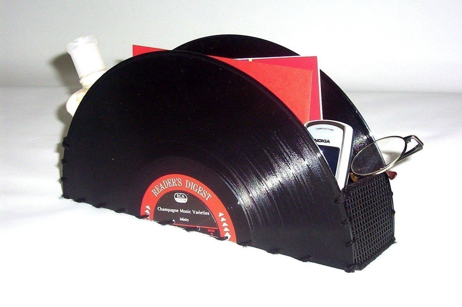 Аналогичная техника используется при создании настольных карандашниц-органайзеров. Но обычно для них берутся не большие пластинки, а маленькие, семидюймовые (так называемые миньоны).