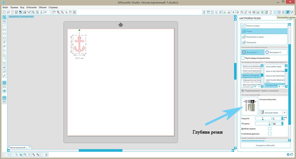 - В верхнем правом углу нажимаем кнопочку «настройки резки» и выставляем тип материала. У меня это скрап-бумага с рисунком, поэтому я выбрала пункт «Бумага с рисунком. Средний вес 180 г/м2». В строке «Тип ножа» выбираем «Automatic Blade» и обязательно смотрим на цифру глубины резки, для скрап-бумаги она должна быть 3-4, в зависимости от плотности бумаги. Если вы хотите резать на плотном дизайнерском картоне, выбирайте подходящий материал с глубиной резки 4-5. Глубина резки 6-7 для очень плотных материалов. При выборе глубины резки будьте очень аккуратны — можете прорезать коврик.