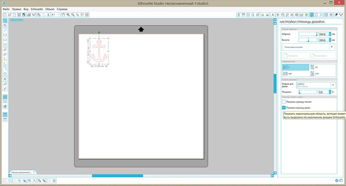 Из библиотеки бесплатных дизайнов выбираем якорь. Двойным щелчком мыши рисунок переносится на наш листок. Выставляем нужные размеры (размеры показаны в мм). Ставим галочку граница резки.