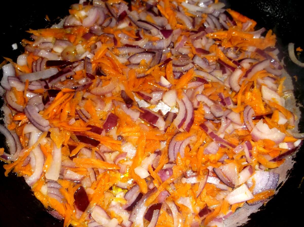 Овощи, морковь с луком очистите, лук нарежьте четвертинками и измельчите, морковь натрите на крупной терке. В разогретую сковороду высыпьте овощи и обжарьте до готовности.