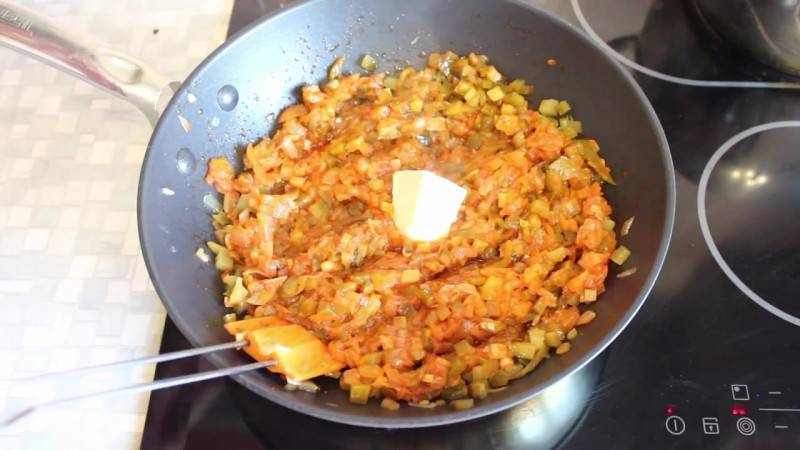 Маринованные огурцы нарежьте кубиками и добавьте в сковороду к луку и моркови, через пару минут обжарки влейте две столовые ложки томатной пасты и перемешайте.
