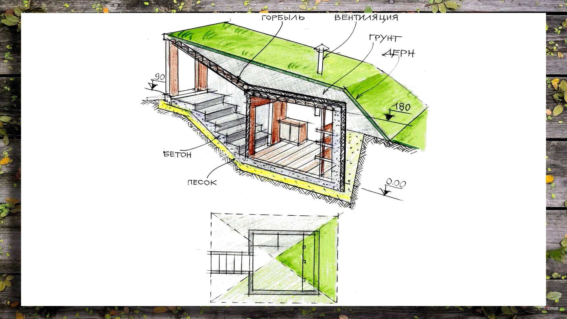 Устройство насыпного погреба: вид спереди и сверху.