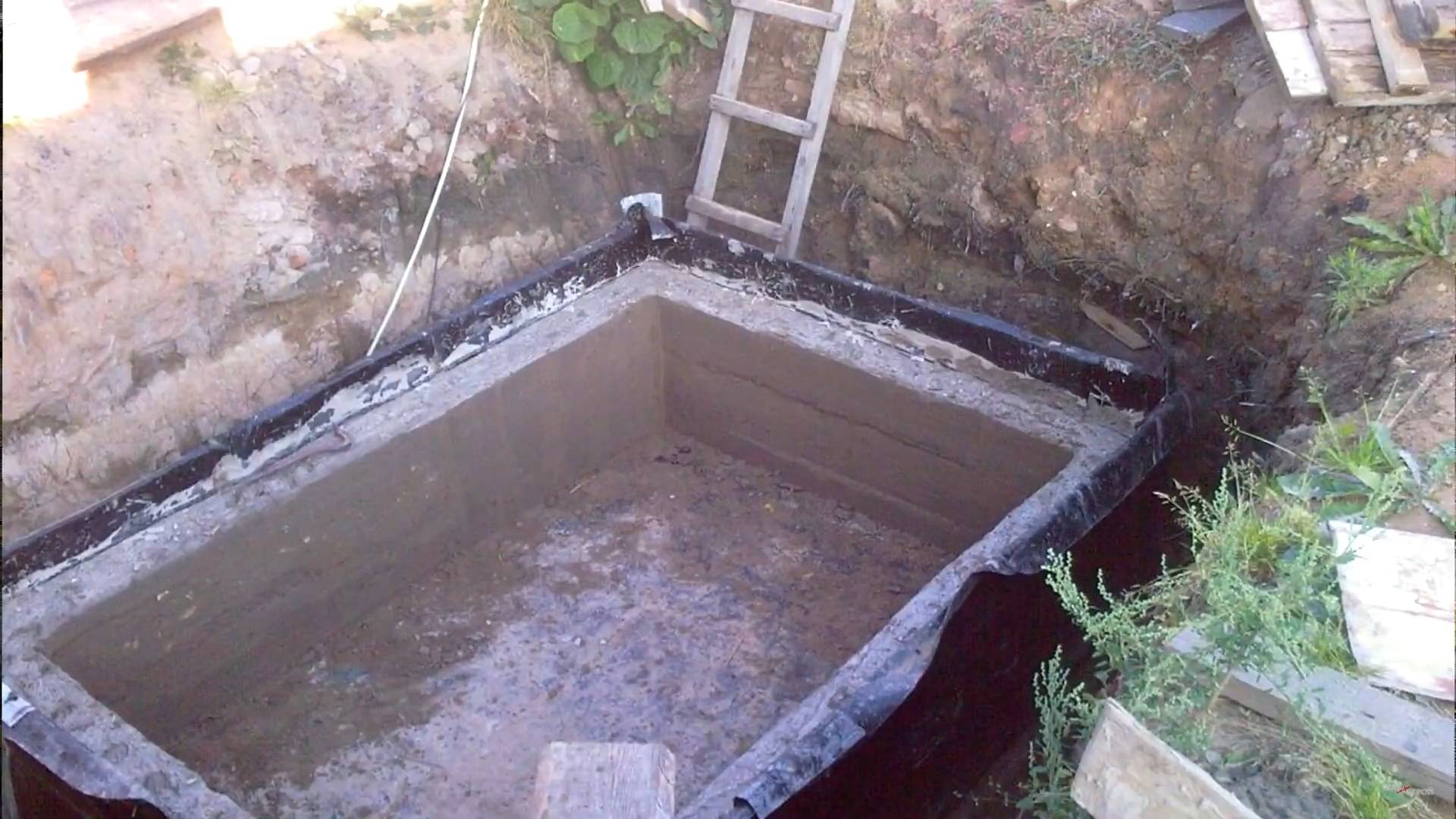 - Настилают на дне два слоя рулонной битумной изоляции. Проваривают горячей мастикой швы каждого слоя. Края полотен выводят за периметр днища не менее чем на 20 см.