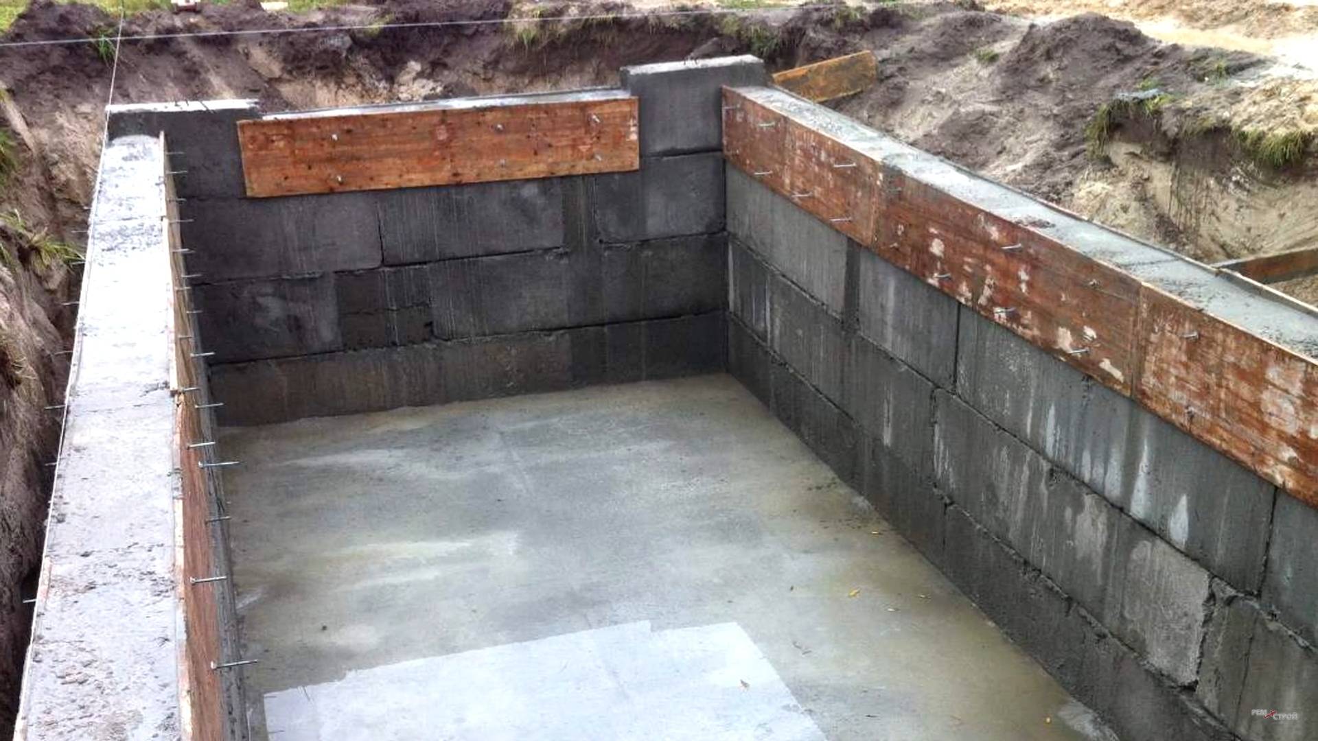 | Стены | Кирпичные, покрываются гидроизоляцией | Заливка бетоном между опалубками, покрываются гидроизоляцией | ||