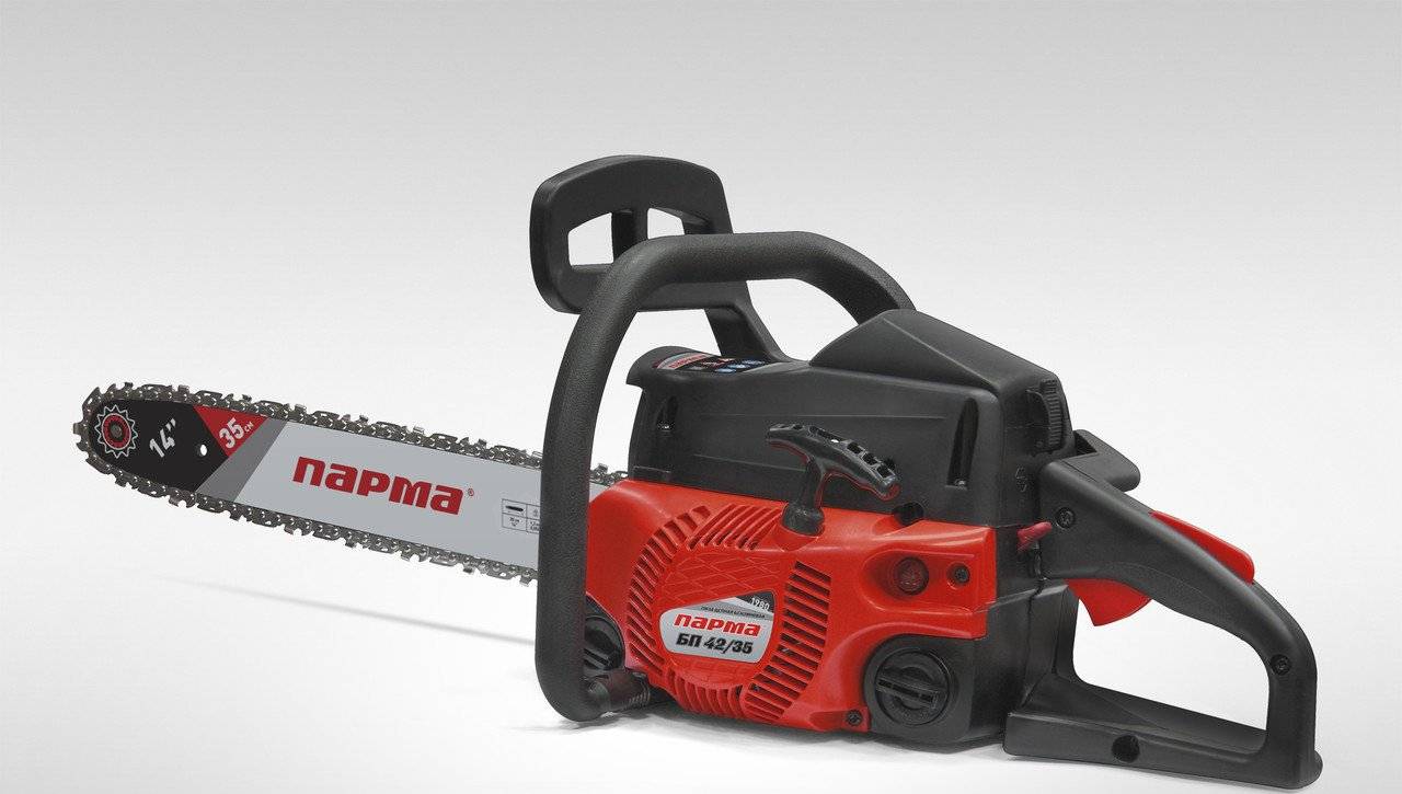 Цепные бензиновые пилы Парма представлены двумя моделями: БП 42/35 и БП 46/40, соответственно: мощность — 1,8 л.с. и 2 л.с., длина шины 35 см и 40 см. В базовой комплектации бензопил пильная цепь и шина Rezer, гарантийные документы, инструкция по эксплуатации изделия, чехол для шины, емкость для приготовления топливной смеси, набор инструментов для регулировки и заточки цепи, упор с крепежом. Модификация БП 46/40 выпускается в двух версиях – с кейсом для пилы или без футляра.