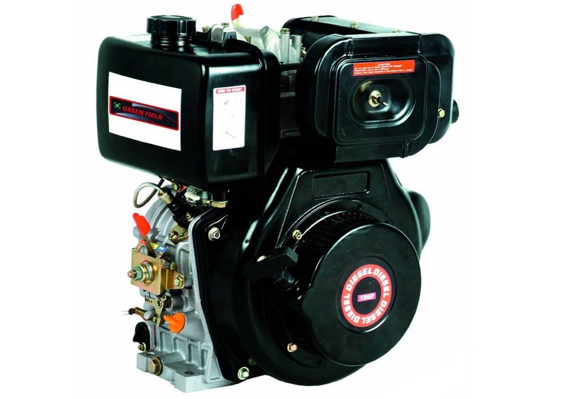 - GREEN-FIELD LT 178 F – неплохое качество заводской сборки, при этом стоимость составляет в среднем 21 500 рублей. Дизельный мотор с воздушным охлаждением, объем камеры сгорания – 296 см³. Мощность – 7 л.с., подойдет для небольшой техники. Запуск ручной с помощью пускового троса. Вес 33 кг.