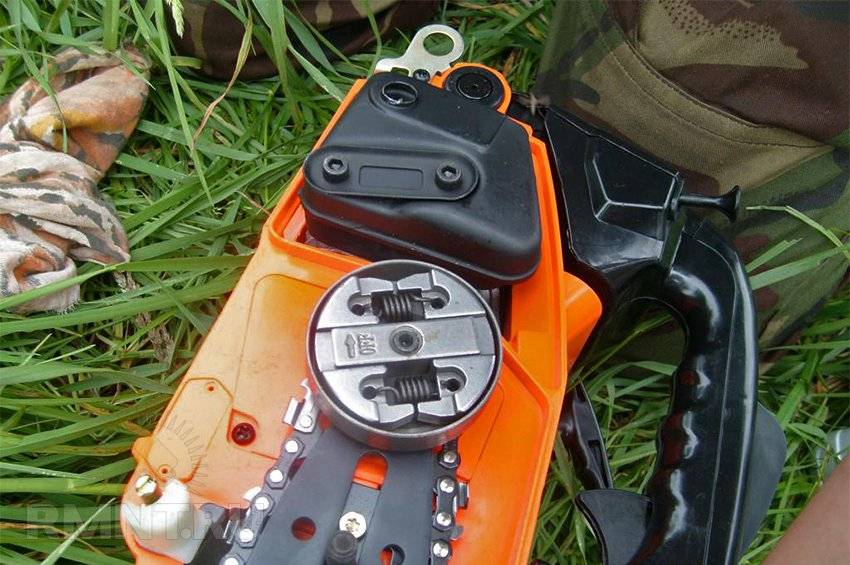 На первом этапе требуется снять крышку тормоза цепи. Для этой цели требуется потянуть ручку на себя. Это делается для того, чтобы лента не контактировала с чашкой сцепления. После этого ослабляются гайки крепления крышки и натяжитель цепи.