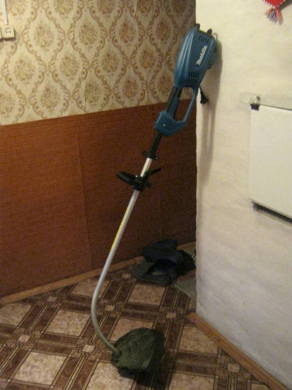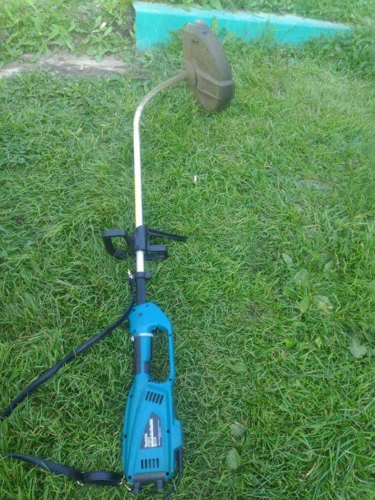 Масса этой электрокосилки 4,9 кг. В верхней части прямой штанги триммера закреплен электрический мотор мощностью 1000 Вт. Питание электромотора производится от электросети 220 В.
