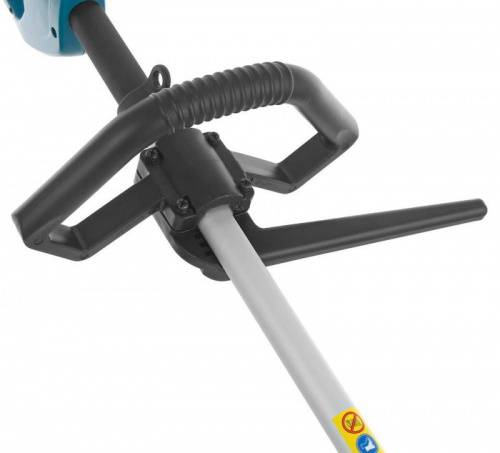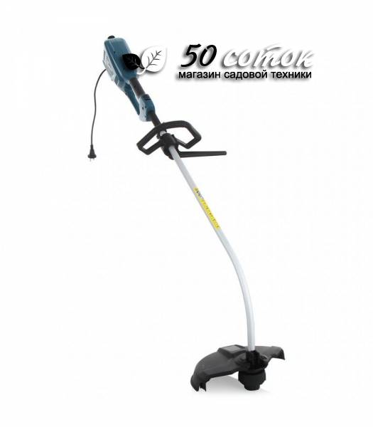 Масса электрокосы всего 4,3 кг. Электродвигатель имеет мощность 700 Вт и потребляет электроэнергию от сети 220 В. Электромотор размещен в верхней части конструкции. Штанга изогнутая с d-образной прорезиненной рукояткой.