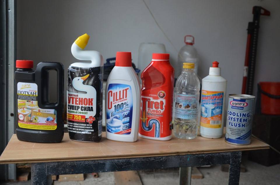 Средства могут быть как кислотосодержащие, так и бескислотные. Кроме основного действующего вещества, в состав готовых средств входят ингибиторы коррозии, загустители и другие дополнительные компоненты.