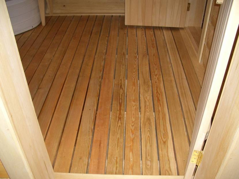 Под деревянным полом необходимо делать бетонное основание с уклоном к центральной части, где и будет идти жёлоб, присоединяющийся к канализации.