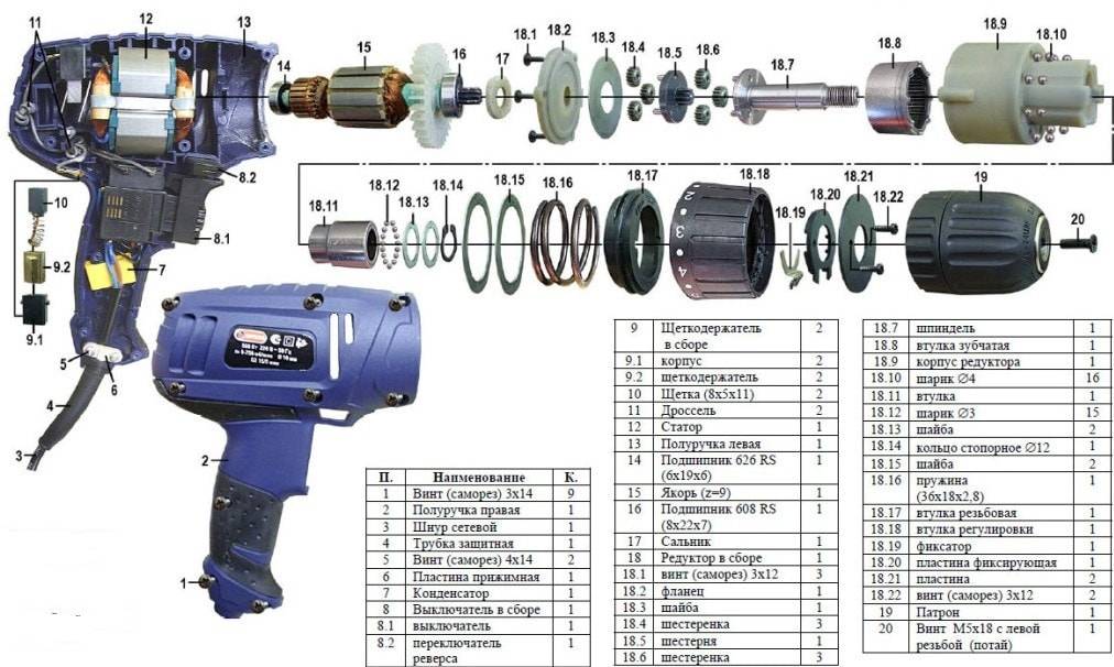 Все шуруповерты очень похожи как по внешнему, так и внутреннему строению. Они состоят из таких элементов, как: