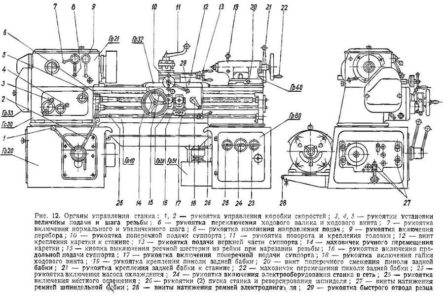 Чтобы узнать устройство оборудования можно посмотреть схему токарного станка. На ней будут указаны ключевые узлы, соединительные элементы и механизмы для настройки.
