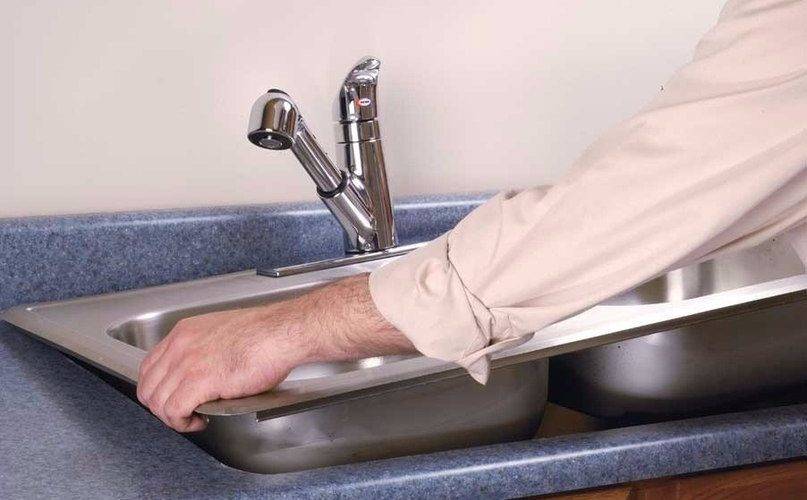 - берется специальный и инструмент и им прорабатываются участки соприкосновения с моечной поверхностью, При этом возникают углубления, соответствующие толщине бортов устанавливаемой мойки;
