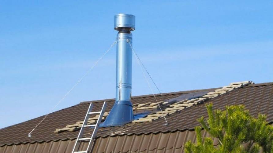 При потребности установки высокой трубы, ее раскрепляют стальными растяжками к специальным анкерам, заделанных в конструкцию крыши.