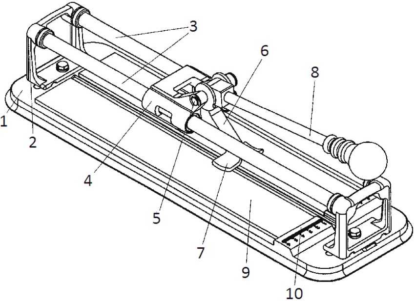 Устройство ручного плиткореза: 1 — основание, 2 — стойки, 3 — направляющие, 4 — каретка, 5 — ось качания, 6 — коромысло, 7 — ломающий узел, 8 — ручка управления, 9 — подложка, 10 — измерительная линейка.