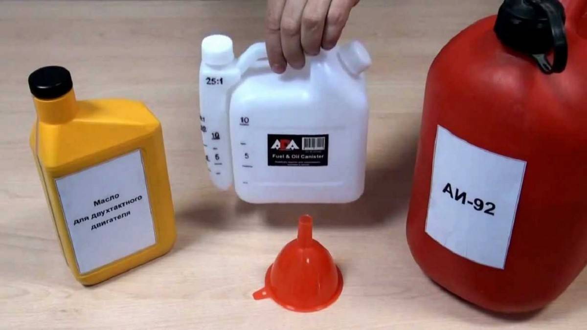 Для соблюдения точного соотношения масла и бензина требуется наличие двух чистых и сухих емкостей. В одну из них, с метками объема, добавляется двухтактная смазывающая жидкость.
