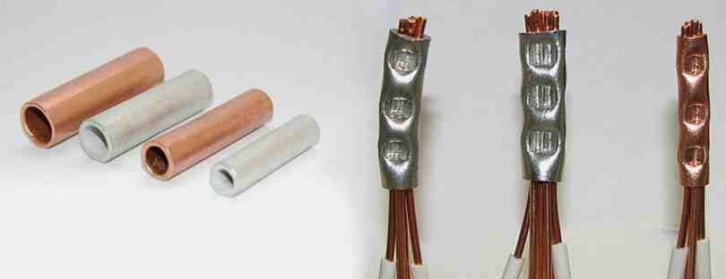 Ещё один способ соединения проводов — это опрессование. Это способ, при котором на соединяемые провода или кабели одевается медная или алюминиевая гильза, после чего опрессовывается специальным опрессователем. Для тонких гильз используют ручной опрессователь, а для толстых гидравлический. Этим способом можно даже соединять медные и алюминиевые провода, что недопустимо при болтовом соединении.