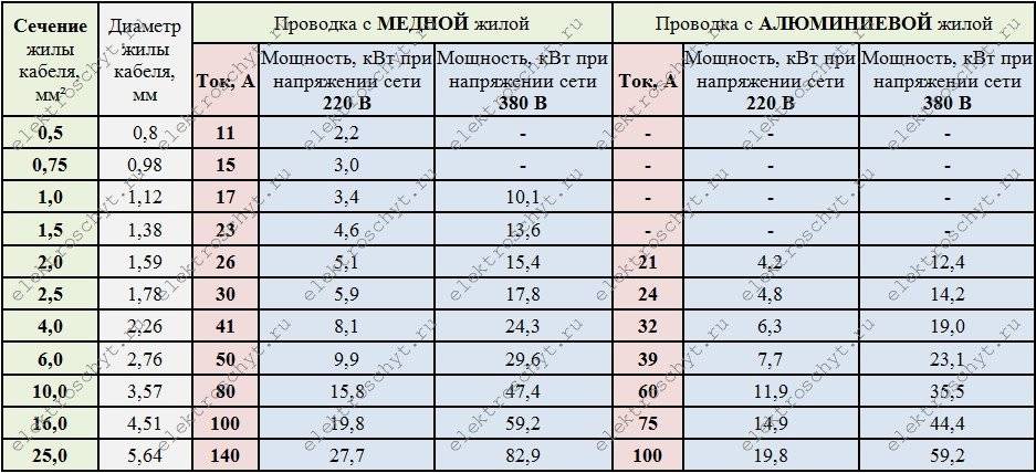| 2,5 мм2 | 1,78 мм | 21 А | 4,6 кВт | 8,0 кВт | 16 А | 3,5 кВт | 6,1 кВт |