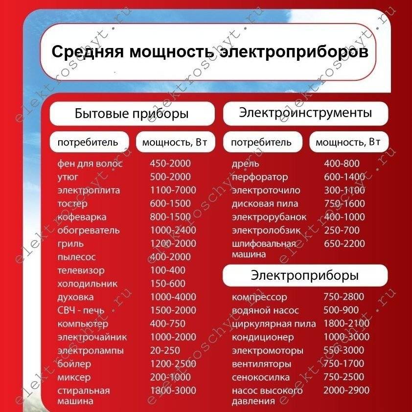 Находите ту технику, которую планируете ставить, выписываете мощность. Дана она порой с большим разбросом, так что иногда трудно понять, какую цифру брать. В данном случае, лучше брать по-максимуму. В результате при расчетах у вас будет несколько завышена мощность оборудования и потребуется кабель большего сечения. Но для вычисления сечения кабеля это хорошо. Горят только кабели с меньшим сечением, чем это необходимо. Трассы с большим сечением работают долго, так как греются меньше.