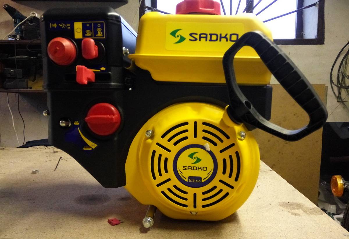 Неплохой вариант получается из установки на данный мотоблок двигателя SadkoDE-220, мощность которого составляет порядка 4,2 л.с. Диаметр вала составляет 19 мм, запускается при помощи шнура.