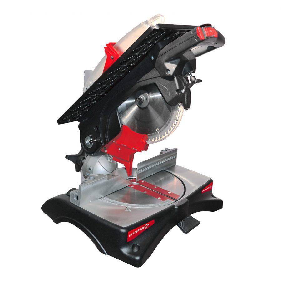 Торцерезка от китайского производителя. Отличается скромными показателями, но и невысокой ценой. Может пригодиться при проведении ремонтных работ, например, при установке межкомнатных дверей или домашнему мастеру для частного использования. Хорошо заменяет ручной инструмент, при покупке доплата будет совсем небольшой. Обладает следующими характеристиками: мощность 1300, диаметр оснастки — 210, скорость вращения – 5000, возможен поворот стола и наклон пилы на 45°. Пользователи отмечают, имеет небольшой люфт, который практически не сказывается на точности пропила. Для облегчения обслуживания — быстрый доступ к щеткам. Для защиты от несанкционированного включения, есть блокировка пусковой кнопки.