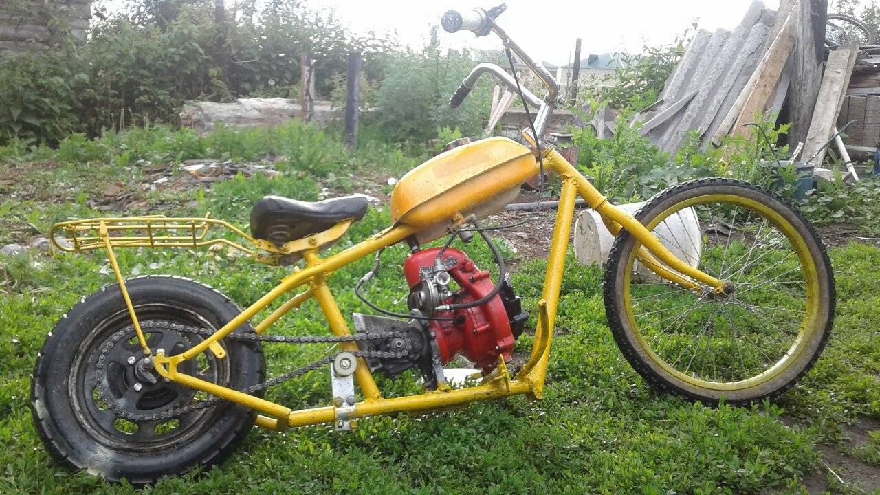 Старшему поколению знакомы самоходные конструкции в виде велосипеда с моторчиком. Эту технику сложно отнести к мопедам, но и в категорию велосипедов они уже не попадают. Своего рода «среднее звено». Существенным достоинством такого агрегата является низкое потребление топлива и возможность ездить без прав. На дорогах общественного значения на нем кататься нельзя, но по сельским улочкам и проулкам передвигаться можно.