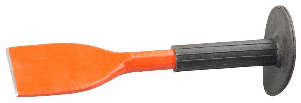 Нельзя забыть и о слесарном зубиле – металлическом стержне, которым рубят металл или применяют в отделочных работах, если нужно отколоть небольшой кусок бетона. Зубило делается из закаленной стали, один конец стержня слегка заокруглен для удобства ударов молотком, второй край, который еще называют «хвостовиком», расплющен и заточен. Часто для безопасности руки, которой держат зубило, с ударной стороны надевается пластиковая насадка со шляпкой.