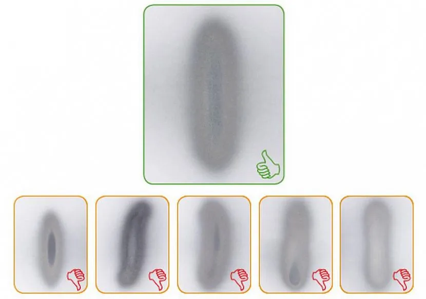 По виду пятна делают вывод о качестве отпечатка. Иногда неправильный результат можно откорректировать. Нарушение формы бывает также связано с несбалансированностью подачи воздуха и краски.