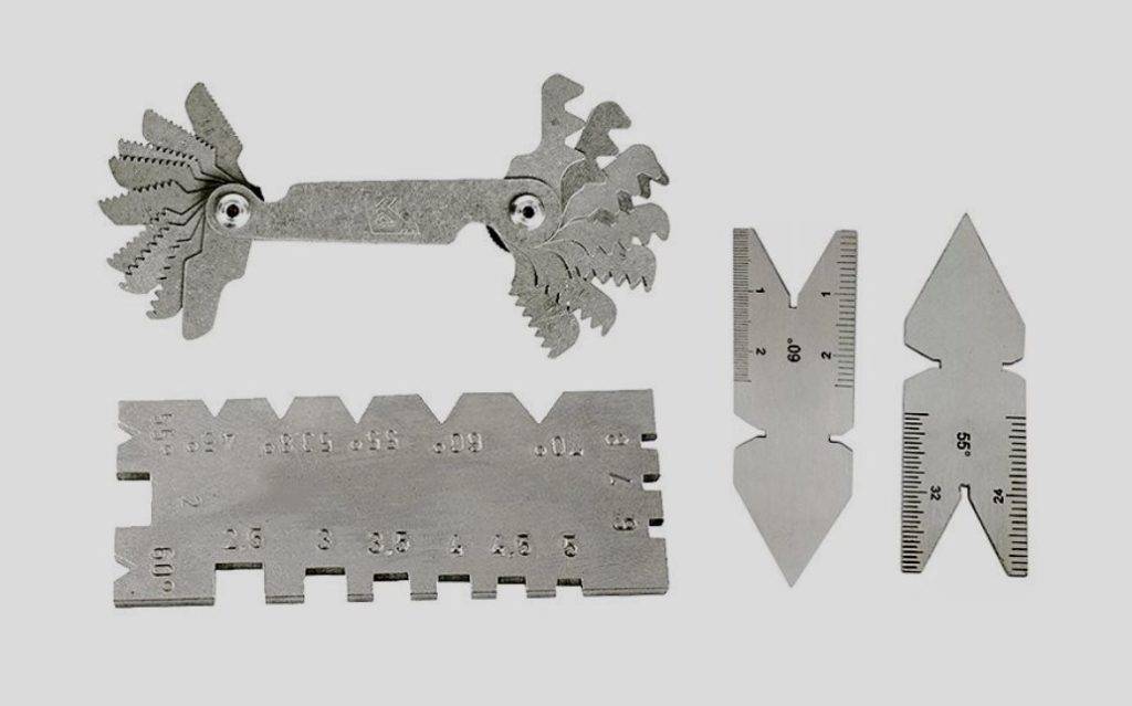 Резьбомер – это набор шаблонов, изготовленных из прочных металлических пластин. Их толщина около 1 мм. Один конец пластин имеет вырезы, калибром сопоставимые с измеряемой резьбой – шагом и профилем. Такие пластинки с зубчиками мастера называют гребенками. Метрические гребенки имеют обозначение шага резьбы, дюймовые — количество ниток помещающихся в одном дюйме.