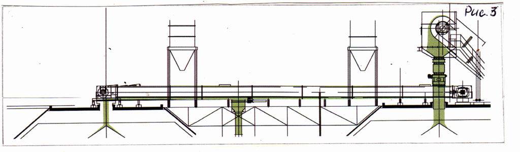 Для восприятия нагрузки от столба материала на ЦК в зоне загрузки устанавливается разгрузочный стол, под разгрузочным отверстием бункера (рис.6). Такое выполнение загрузки ЦК, обеспечивает объёмную разгрузку материала с помощью регулирования высоты слоя материала, которая контролируется с помощью изменения скорости перемещения цепи, путём изменения скорости вращения электродвигателя с частотным регулированием, или установкой механического регулятора высоты слоя, вручную или с приводом.