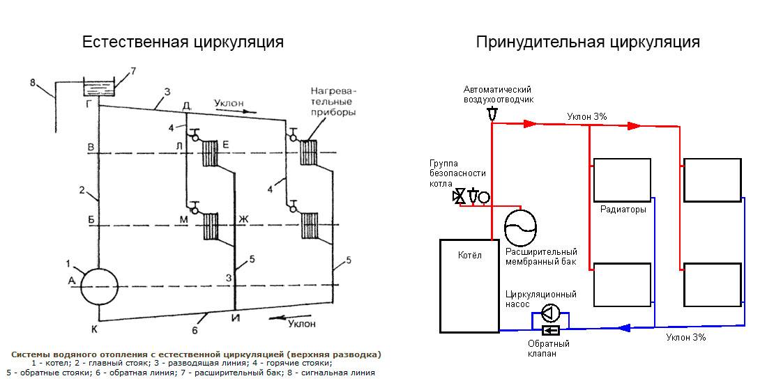 Естественная и принудительная схемы циркуляции теплоносителя в системе отопления.