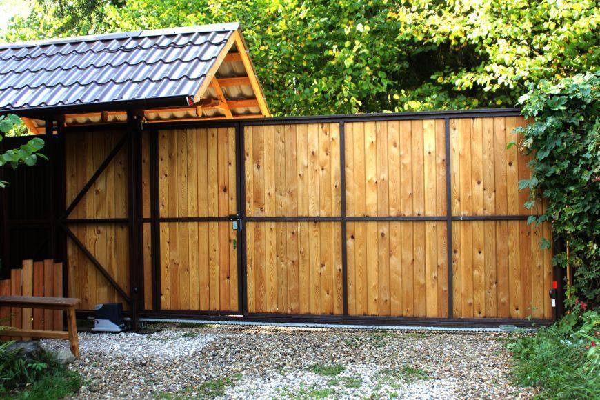 Данный тип напоминает раздвижные комнатные двери. Ворота представляют собой одну панель с роликовым основанием, которая перемещается вдоль забора. Такой тип открывания выгоден тем, что не требует дополнительного пространства.