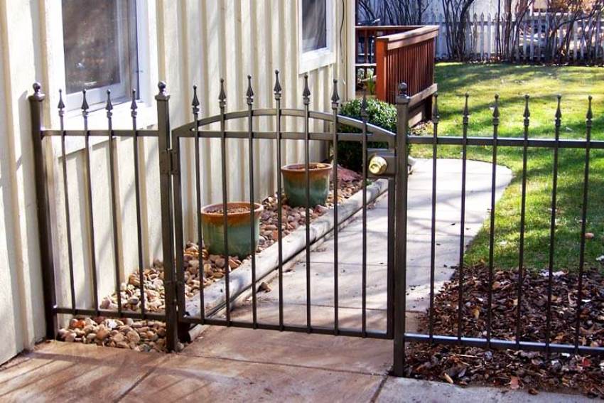 Кованая калитка и забор могут быть расположены на разной высоте