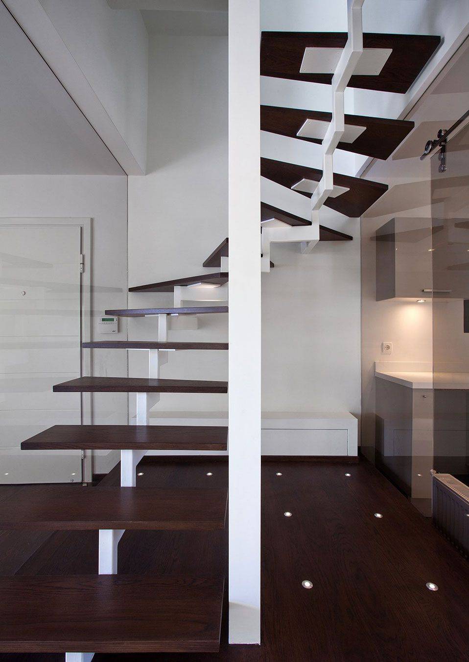 Кстати, лестницы темных тонов визуально кажутся больше и объемнее, но если они контрастируют с белыми стенами, то будут выступать уже в роли эффектного элемента в интерьере. Если поддержать целостность композиции несколькими деталями (шторами, подушками, аксессуарами), то пространство заметно преобразится.