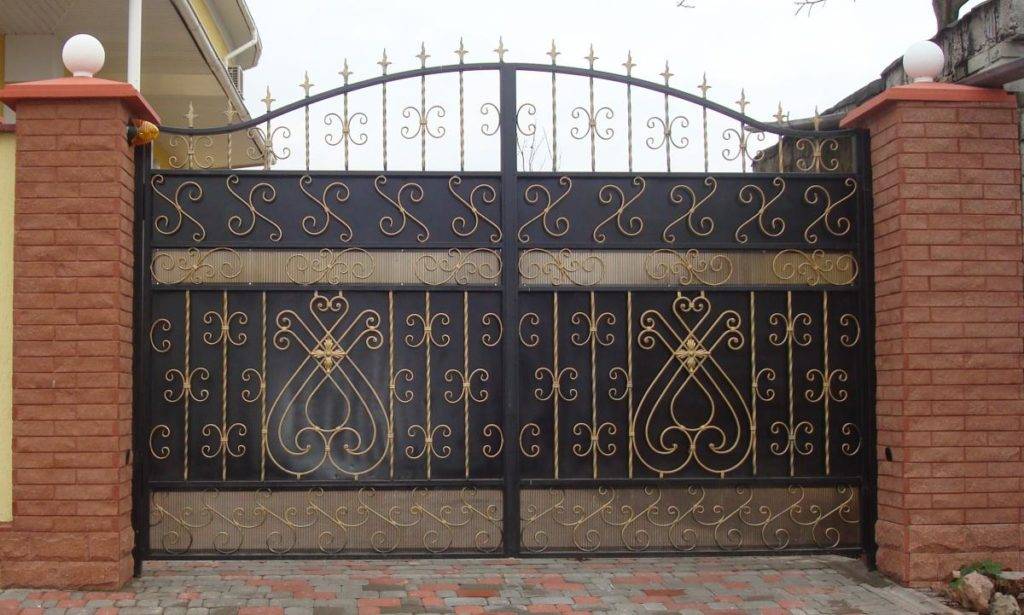 - прозрачность – презентабельные фасады обычно выставляются напоказ, используется заполнение створок крупным узором, частично разбавленным мелкими элементами, при необходимости максимальной конфиденциальности участка используются ворота из профнастила с элементами ковки, как на верхнем фото;