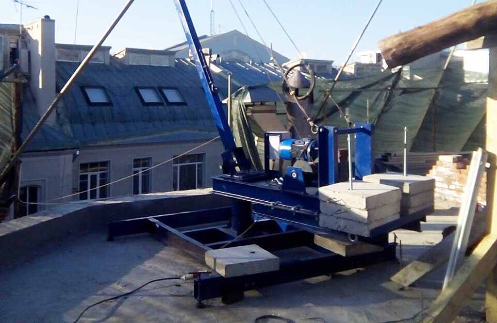 Второй вариант в котором осуществляется поставка это кран передвижной на колесах, данный кран можно свободно передвигать по поверхности крыши здания, многие для удобства сооружают из швеллеров рельсы и кран без усилий передвигается вдоль всего здания.