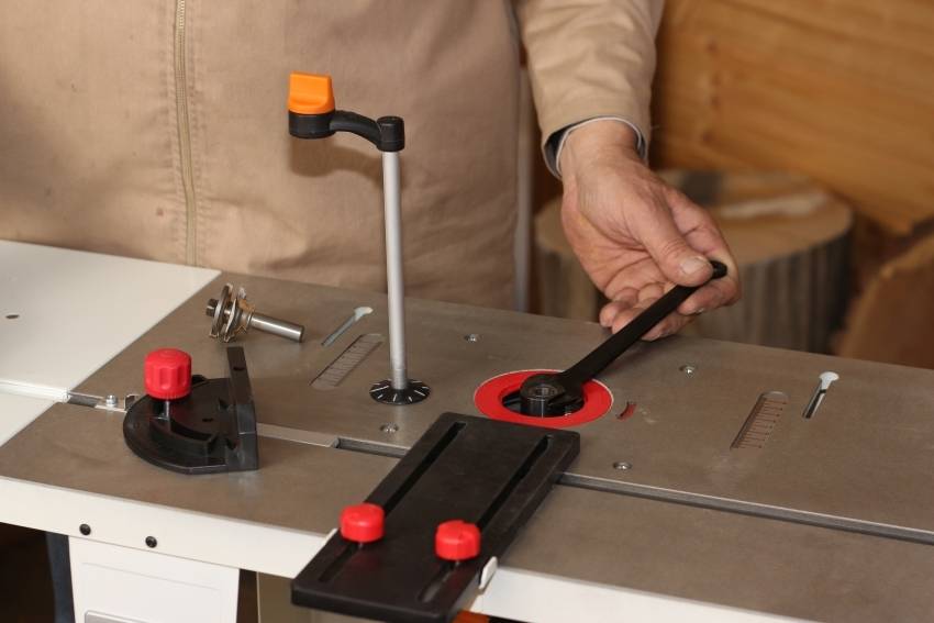 - Опустите фрезу таким образом, чтобы шип в ее центре не доходил до поверхности стола 2-3 мм, и зафиксируйте привод на направляющих.