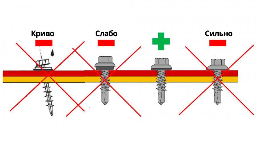 При закручивании саморезов важно следить, чтобы они входили в металл под прямым углом и не перекашивались. Практики рекомендуют пользоваться профессиональными инструментами, имеющими регулировки усилия вращения патрона