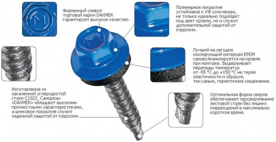 Помимо резьбы, проходящей по телу этих элементов, на их конце имеется пара вертикальных лезвий для сверления. При ввинчивании метиза они просверливают пилотное отверстие, то есть монтаж выполняют непосредственно в основание из металла без предварительного просверливания. Эти изделия предупреждают деформацию металлического покрытия и предохраняют его от повреждений в местах крепления. В комплектацию входят также шайба из металла и запрессованная прокладка из атмосферостойкой резины. Головка метизов шестигранная. Монтируют их с помощью биты под кровельный саморез.