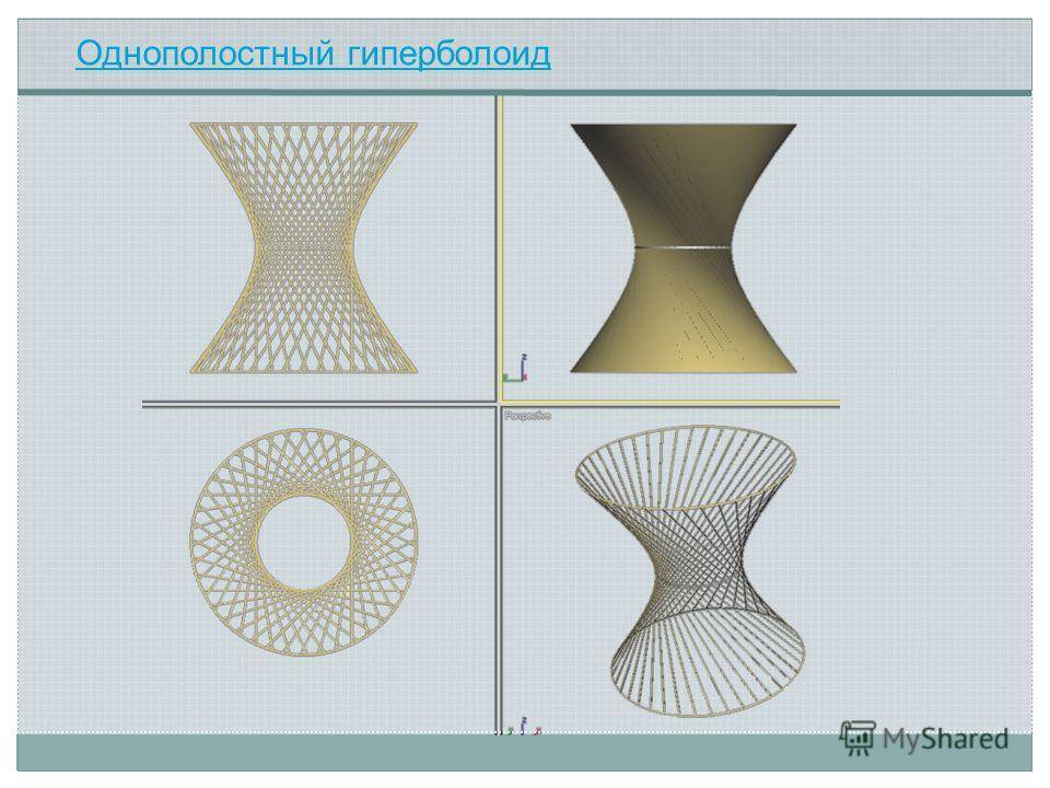 | Параболоид гиперболический (синонимично понятию косой плоскости) | 2 пересекающиеся прямые направляющие | 1. Изображается как несколько прямых по закону: создающая должна пересекать направляющие и проходить параллельно установленной области параллелизма. 2. При пересечении некоторыми плоскостями в сечениях получаются гиперболы и параболы. | При разрабатывании конструкций гидротехнических строений, дорог, откосов, шлюзов, каналов, крыльев ветряков |