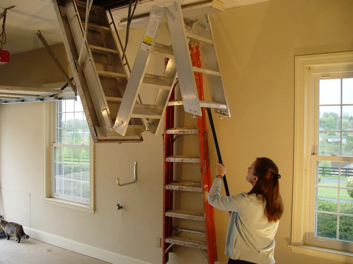 Лестницы для раскладывания обычно комплектуются специальным приспособлением. В одних конструкциях достаточно открыть крышку люка и ступеньки раскладываются самостоятельно. В других — надо дополнительно потянуть за кольцо на последней ступеньке.